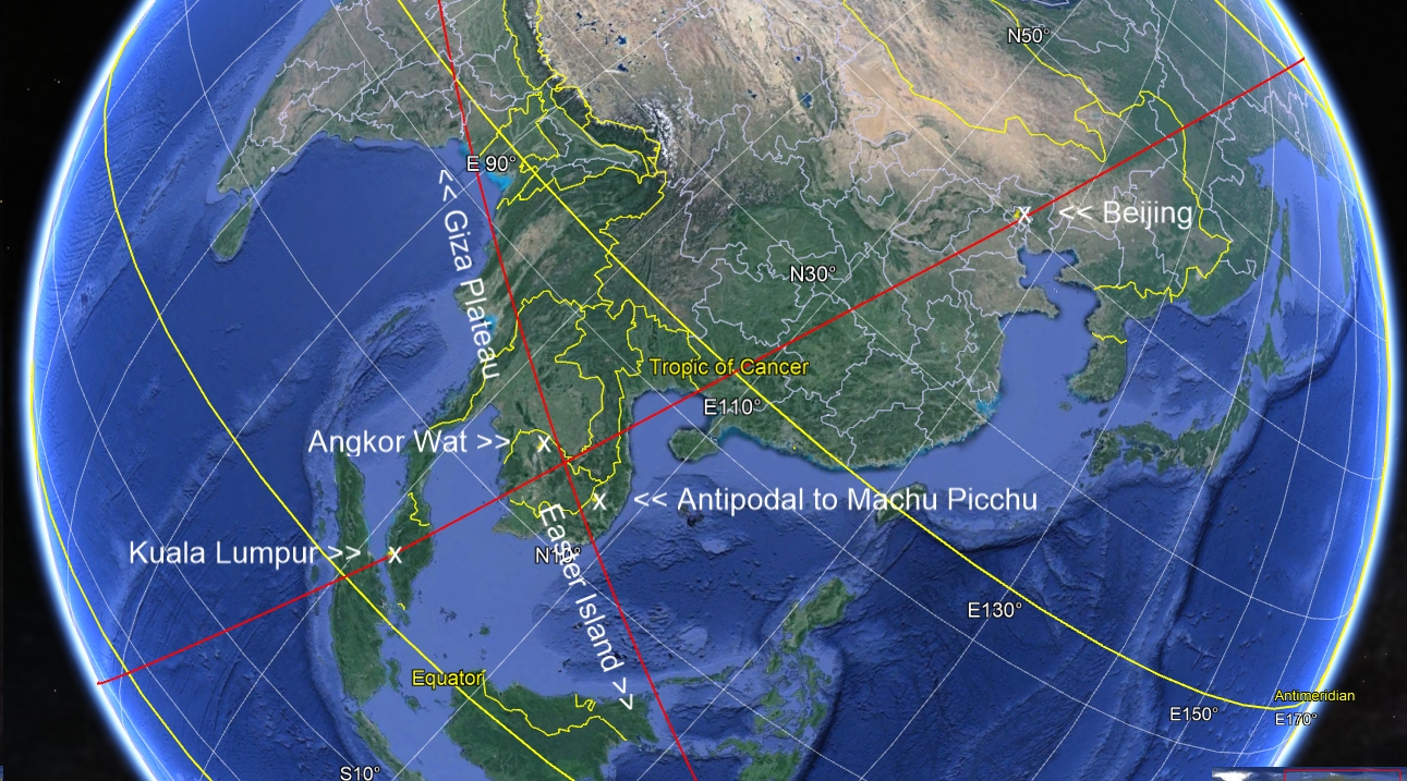 The intended flight path from Kuala Lumpur to Beijing passes between Angkor Wat and the point antipodal to Machu Picchu and a great circle intersecting Quala Lumpur and Beijing passes between Machu Picchu and the point antipodal two Angkor Wat, at the location of The Paracas Geoglyph, on the Paracas Peninsula at Pisco Bay in Peru.. intersects a great circle intersecting the Giza Plateau and Easter Island. The great circles intersect between Machu Picchu and the point antipodal to Angkor Wat and