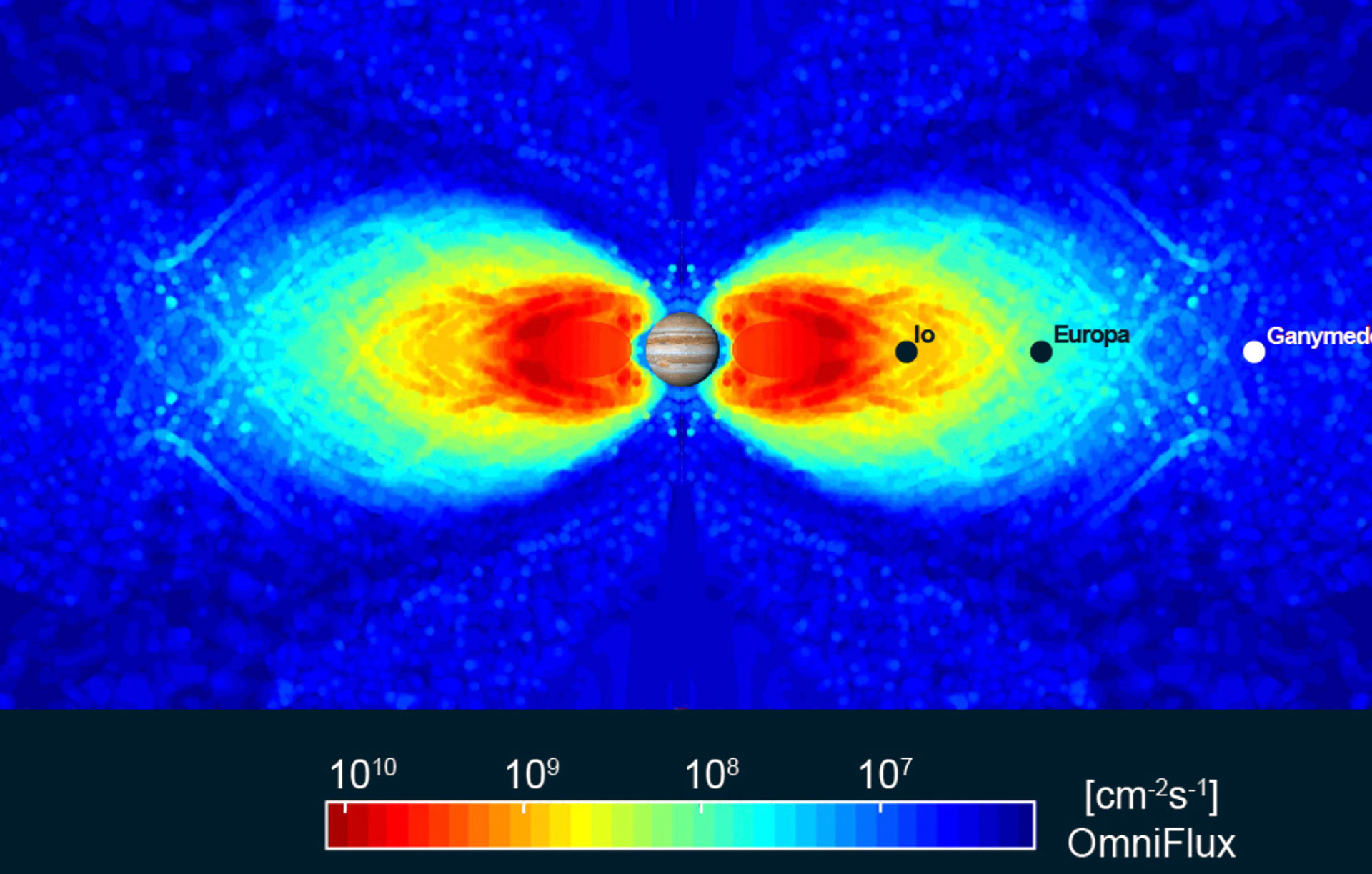 The magnetosphere of Jupiter sweeps up ionized gases and dust from Io’s thin atmosphere at a rate of 1 tonne per second. This material is mostly ionized sulfur, oxygen, chlorine and sodium chloride dust. Io orbits Jupiter with a velocity of 17 km/sec. The Io plasma torus rotates with a velocity of about 74 km/sec. Since Io is embedded in the Io plasma torus, the torus plasma flows past Io with a relative velocity of 57 km/sec.